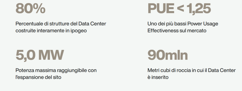 Oltre al vantaggio energetico, la collocazione ipogea offre anche altri benefici: maggiore protezione fisica ( i data center sono infrastrutture strategiche la cui sicurezza da attacchi esterni è un fattore non trascurabile) e soprattutto il riuso di spazi già esistenti, i cosiddetti vuoti di cava, che evita nuovo consumo di suolo. La montagna, da luogo di estrazione, diventa così un’infrastruttura multifunzionale al servizio della transizione digitale.