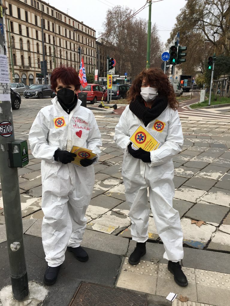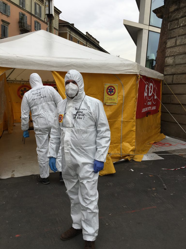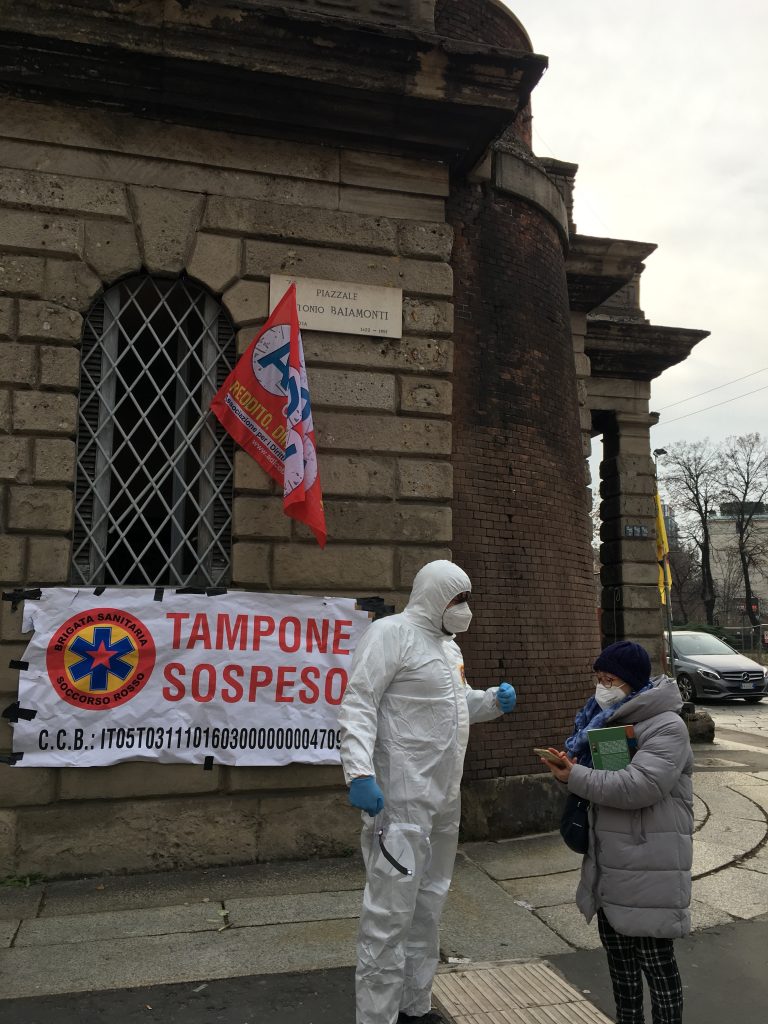It is a cold but sunny Saturday in Piazza Baiamonti in the northern Italian city of Milan, in mid-second wave of Covid-19 last winter. Riccardo Germani, a volunteer, is dressed in his white protective tunic. His job is to ensure social distancing among the people queueing up for the fast lateral flow test inside a highly visible yellow awning. Riccardo is one of about 15 volunteers of the Soccorso Rosso Health Project who have been helping out in the Milanese square every weekend since last December.