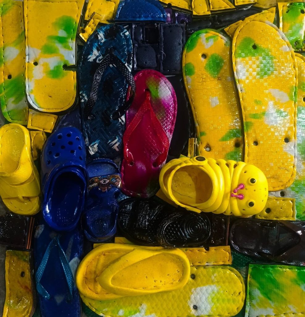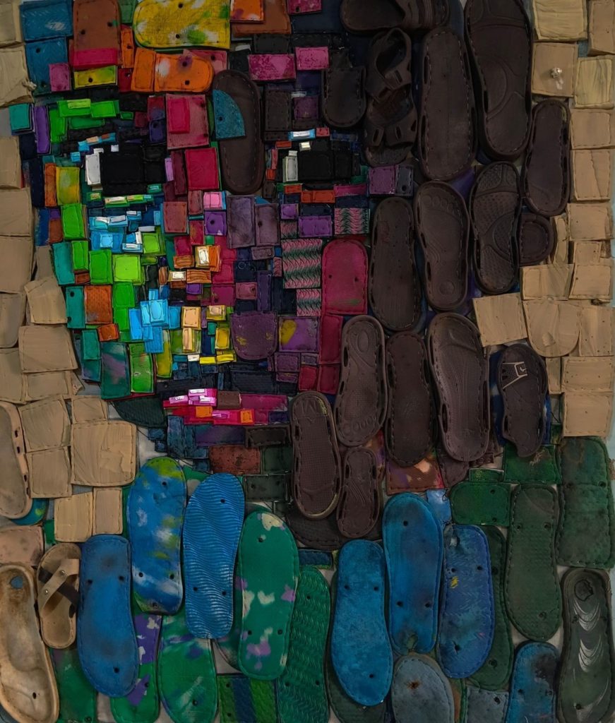 Nella mostra RESTART è evidente che il riciclo ha un duplice significato: da un lato infatti è metafora della restituzione di una nuova vita, dall’altro mostra il concreto recupero della plastica delle ciabatte. Konboye infatti ha recuperato le calzature in plastica da discariche e canali di scolo della sua città, Abeokuta, in Nigeria. Per l’artista la scelta delle ciabatte in plastica non è stata casuale anzi – come ci ha raccontato lui stesso in un’intervista – sono tre i motivi per cui le ha volute usare:
